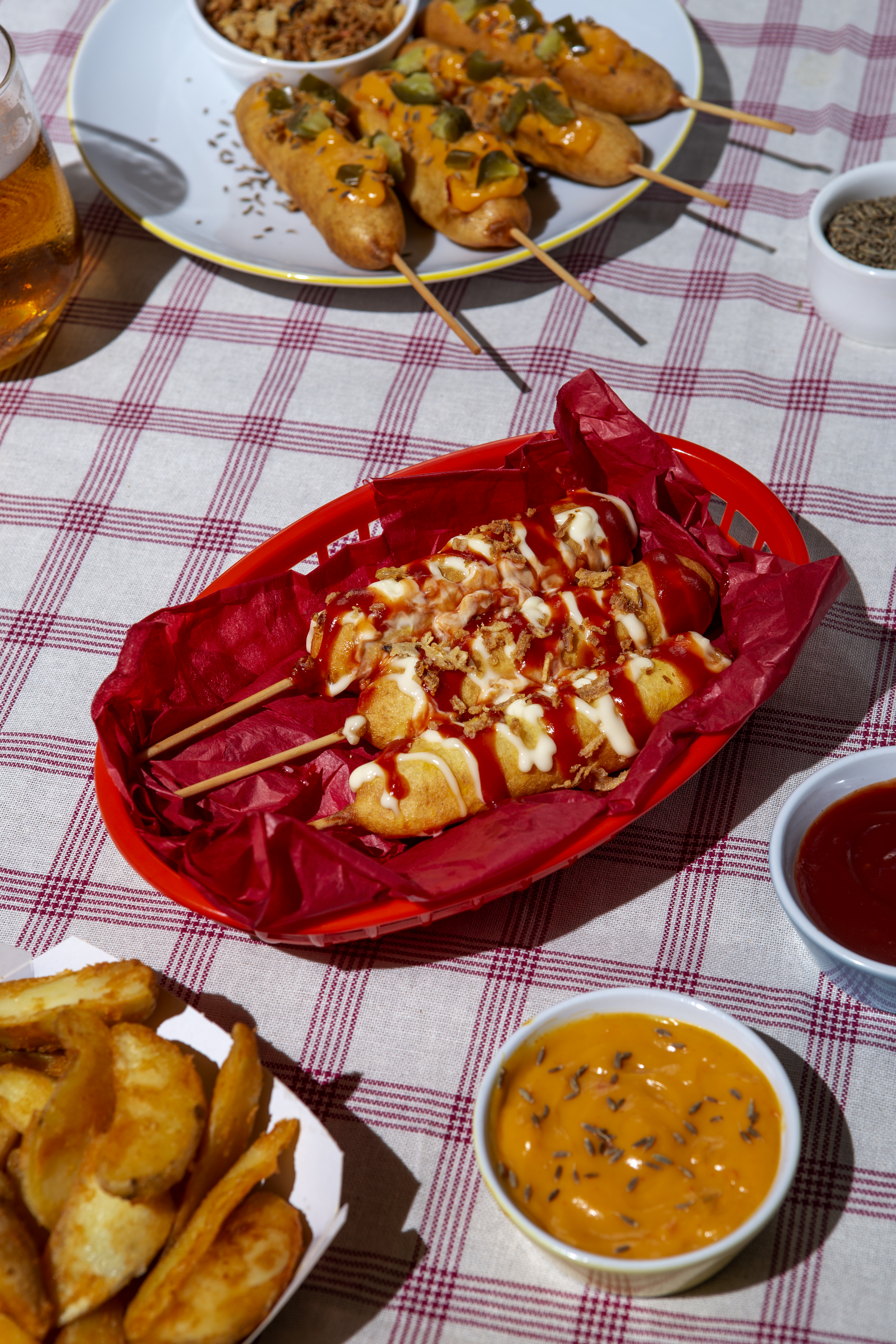 A bold street-style snack combining savory sausage with tangy curry sauce for a unique and spicy kick.