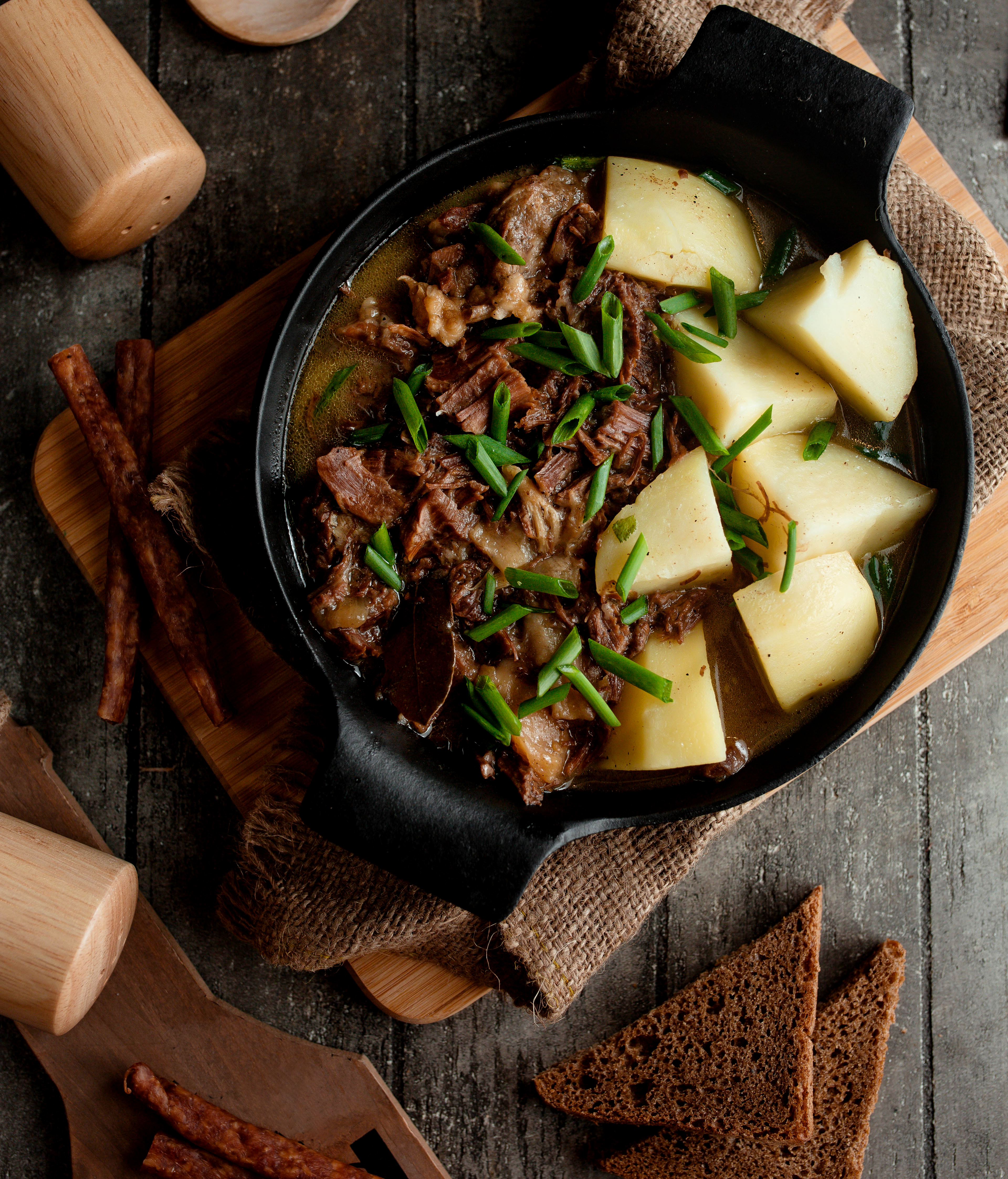 A deeply flavorful slow-cooked roast, infused with spices and rich gravy, offering a hearty and authentic taste.